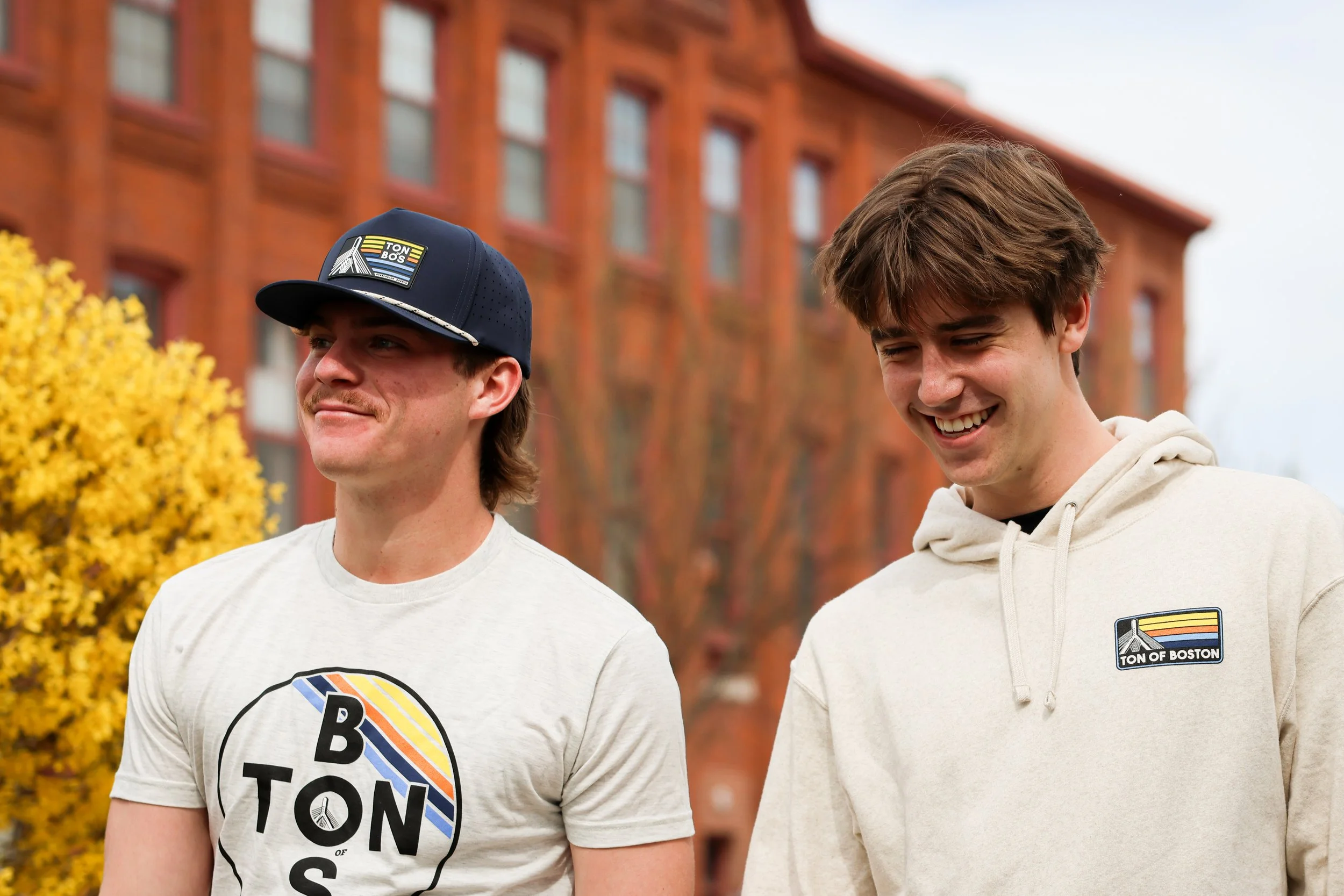 Two young men smiling outside, one wearing a baseball cap and a T-shirt with 'B TON S' and a logo, the other in a beige hoodie with a logo. A red brick building and yellow tree are in the background.